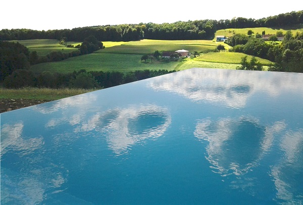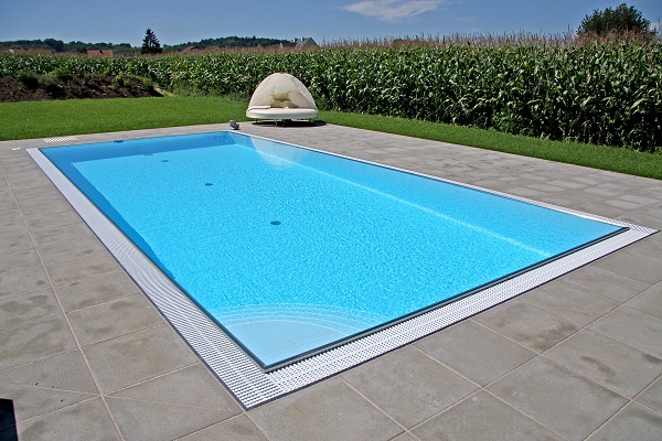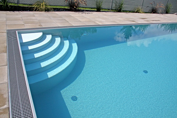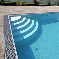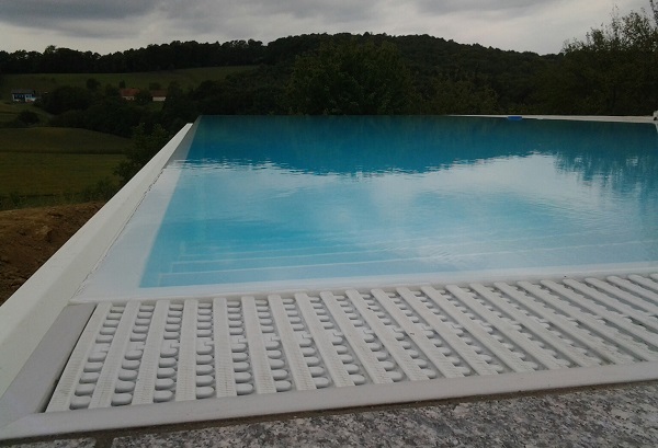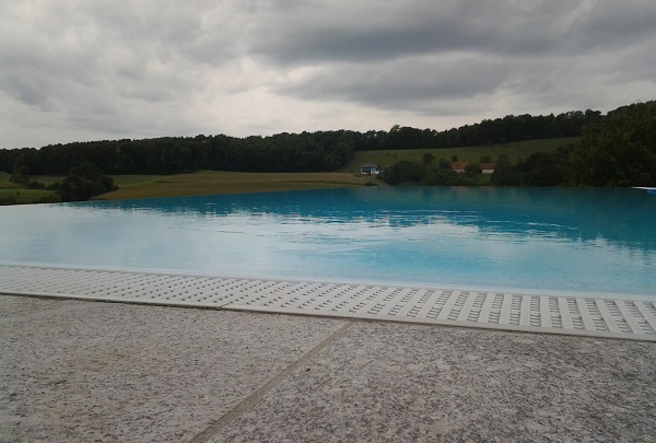 Diese Rinne kann installiert werden, wenn das Gelände neben dem Pool abfallend ist. Der Infinity-Effekt gibt einem das Gefühl, dass das Wasser über das Becken hinaus läuft. Die Infinity Rinne kann auch mit der Deluxe Rinne kombiniert werden (z.B. zwei Seiten Deluxe und zwei Seiten Infinity).